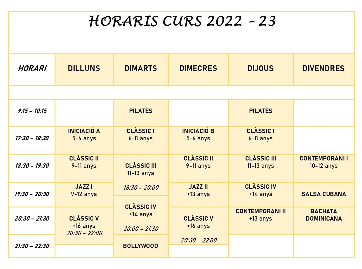Oferim classes de dansa de diferents estils i per a totes les edats, però l’especialitat de l’Escola és la Dansa Clàssica. Tenim un horari amb classes regulars que majoritàriament són en horari de tarda, però també oferim classes particulars en qualsevol franja lectiva. D’altra banda, proporcionem formació de Dansa Clàssica amb el mètode de la Royal Academy of Dance. És una de les institucions més prestigioses de ballet a nivell internacional, i ofereix un programa de dansa clàssica i uns exàmens amb l’objectiu de fomentar un bon aprenentatge.